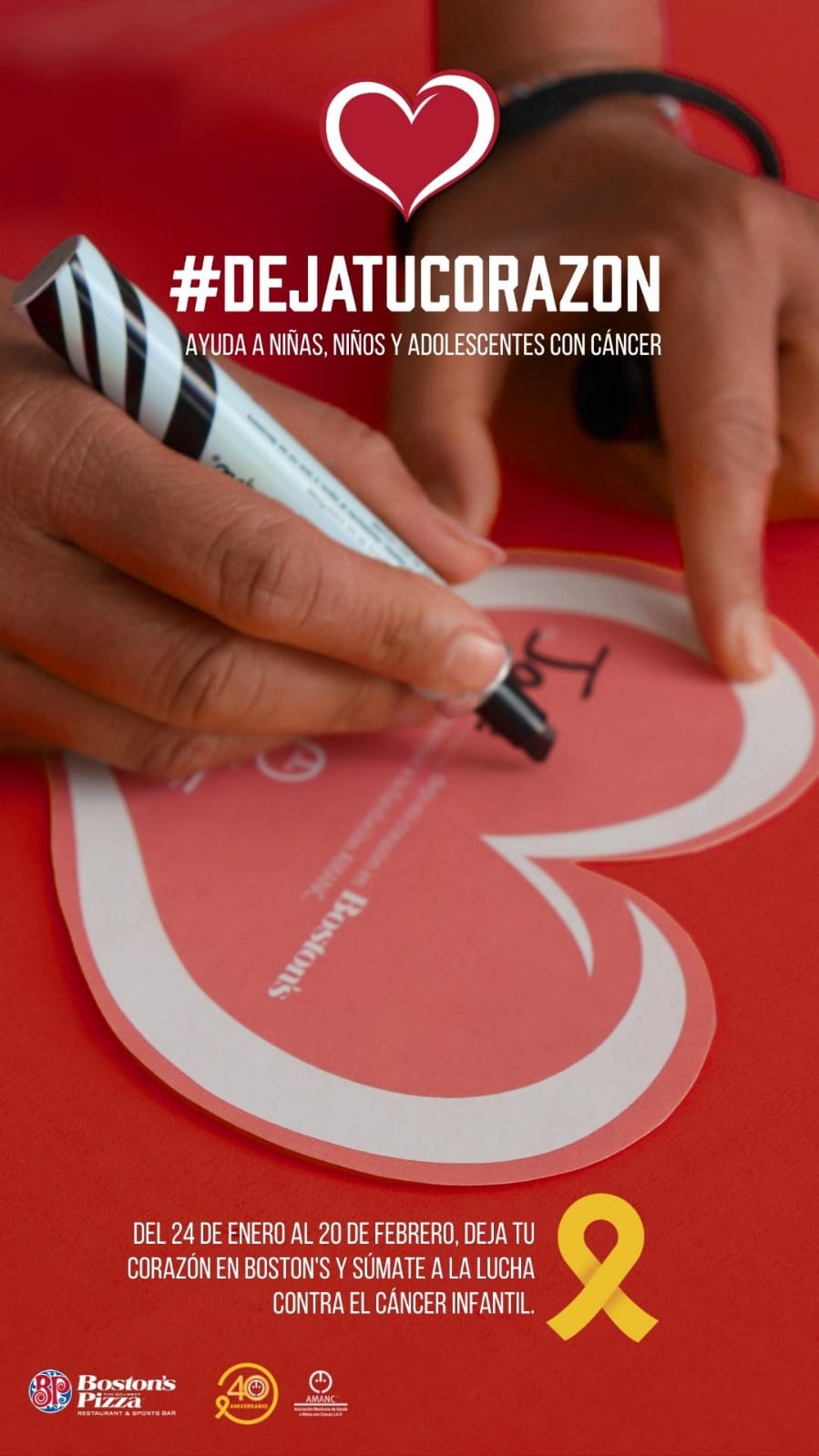 Con la frase “Tu equipo deja su corazón en la cancha. Tú deja el tuyo en Boston´s”, la cadena canadiense de restaurantes Boston’s Pizza invita a donar y recibir un certificado de corazón por apoyar a una noble causa. En Ciudad de México, Campeche, Mérida y Tuxtla Gutiérrez, los donativos se suman a la lucha contra el cáncer infantil.