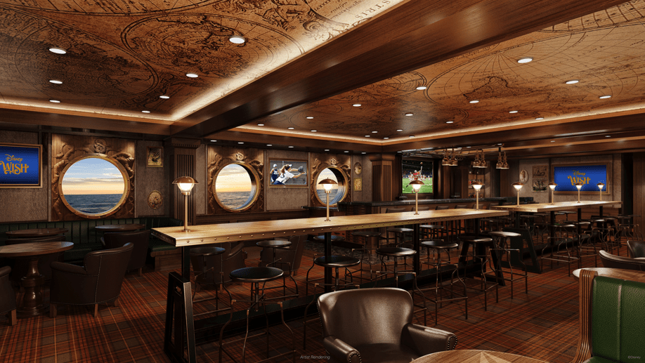 Esta ambientación casual será perfecta para que los pasajeros se relajen y vean deportes en vivo, noticias y eventos importantes mientras degustan una selección especial de cervezas, incluyendo tres cervezas artesanales disponibles exclusivamente a bordo del Disney Wish, junto a una variedad de licores, vinos y cócteles.